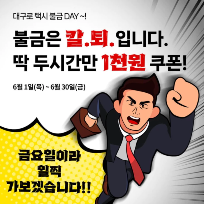 불금! 금요일 택시를 이용하시면 1,000원의 쿠폰을 제공 (6월 1일 ~ 6월 30일 오후 5시 ~ 오후 7시 사이)