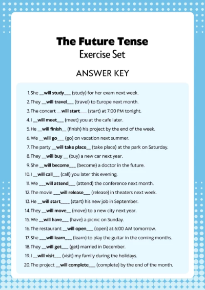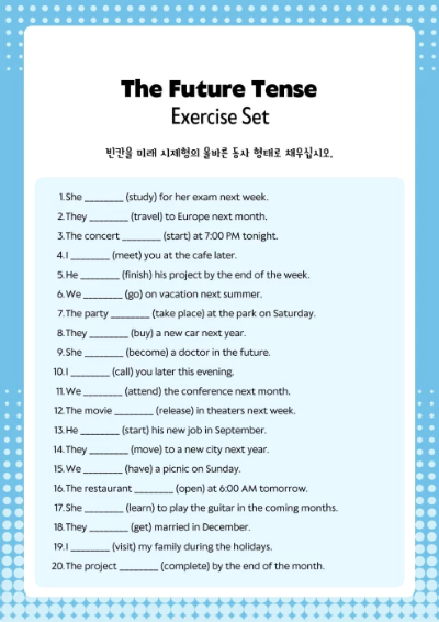 아직 일어나지 않은 미래의 행동이나 상태를 설명합니다. 'will'이나 'be going to' 구조를 사용하여 표현됩니다.