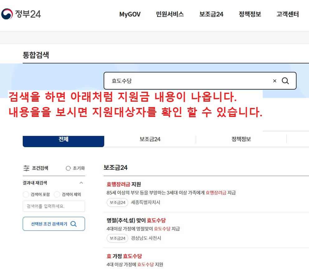 - 검색창에 '효도수당' 또는 '장수수당'을 검색하기