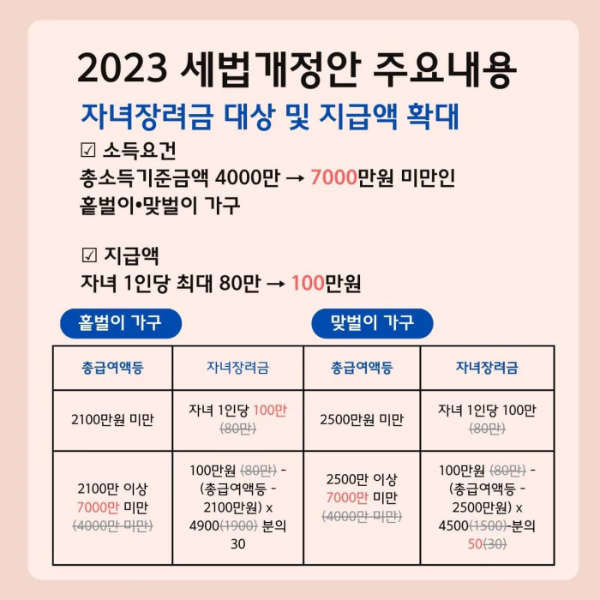 정부는 2023년 세법 개정안을 통해 자녀장려금 지원 대상을 확대하고 지급액을 인상했습니다. 내년부터 자녀장려금을 받을 수 있는 가구는 100만 가구로 두 배로 늘어나고, 자녀 한 명당 최대 지급액은 80만 원에서 100만 원으로 인상됩니다. 아래 개정된 내용 상세히 알려드리겠습니다.