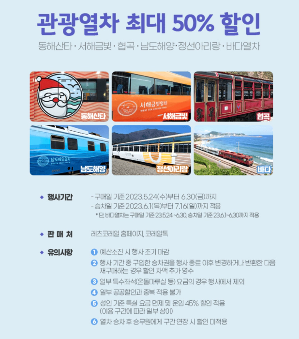 - 관광열차 6개 노선 운임 최대 50% 할인 (서해금빛열차, 남도해양열차, 동해산타열차, 백두대간협곡열차, 정선아리랑열차, 바다열차)
